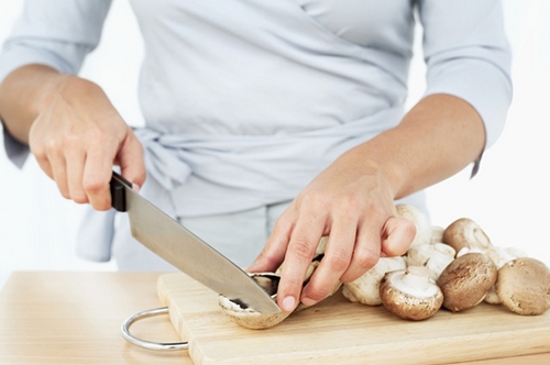 Es necesario cortar los champiñones en una tabla de cortar estable. Corta la fruta por la mitad. Luego, con la mano izquierda, toman convenientemente la mitad para que los dedos queden ligeramente doblados. Esto ayudará a no cortarlos con los champiñones. Después de eso, se corta a lo largo en rodajas.