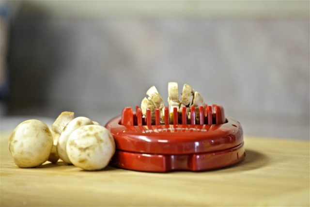 Cortar demasiados champiñones a mano lleva demasiado tiempo. Para facilitar el proceso, utilice un cortador de huevos. Incluso las rebanadas se obtienen fácil y muy rápidamente. Si se necesitan cubos para la juliana, entonces el hongo se da la vuelta como un huevo. Es mejor poner las frutas en el dispositivo con la tapa hacia abajo. Por lo tanto, no se romperán y serán más fáciles de moler.