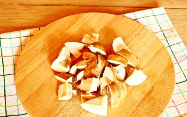- Corta la cosecha del bosque en rodajas. Enviar a una sartén y cubrir con aceite para que las frutas floten en ella.