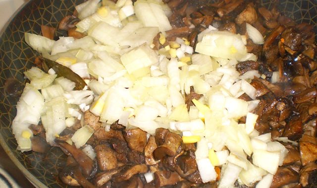 - Retire la cubierta. Cocine hasta que el jugo de champiñones se evapore. En ese momento, la grasa debería ser transparente.