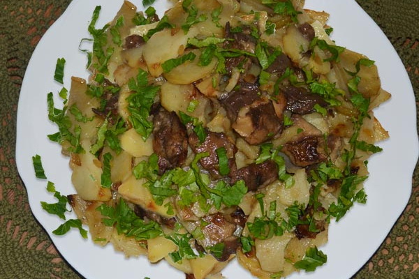 - Combine los alimentos fritos en sartenes. Cocine por 15 minutos. Espolvorea con eneldo picado.