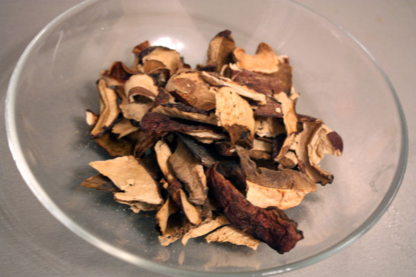 Verter el producto seco con agua y dejar actuar durante tres horas. Durante este tiempo, la pulpa se hinchará y las partículas de escombros acumuladas en la superficie se pueden eliminar fácilmente. El líquido debe filtrarse y verterse nuevamente a los champiñones. Si el agua se ha ensuciado demasiado, es mejor cambiarla. Pero en este caso, el plato terminado resultará menos saturado y aromático.
