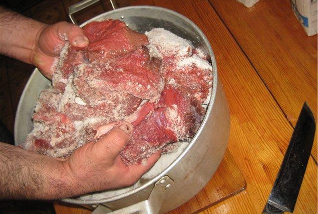 Después, la carcasa debe enjuagarse con agua corriente y secarse con toallas de papel. Es obligatorio realizar su salazón, donde se utiliza un adobo o una salazón seca.