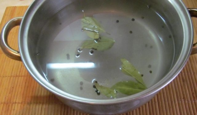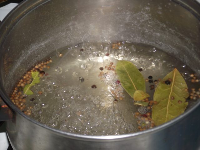 - Agregue ajo (4 dientes), pimiento picante (5 g), mostaza (20 g), guisantes dulces (3 piezas), laurel (2 piezas), especias (20 g), sal (40 g).