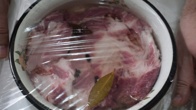 - Coloque los trozos de carne en un recipiente con adobo y envíelos al refrigerador. Resista la pieza de trabajo durante 3 días.