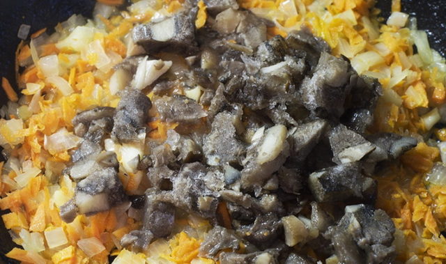 - Agrega los champiñones. Freír la masa hasta que se haya evaporado toda el agua.