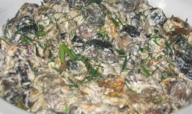 - Ponga los champiñones y las cebollas en un molde, vierta la salsa de crema agria encima. Cerrar con papel de aluminio.