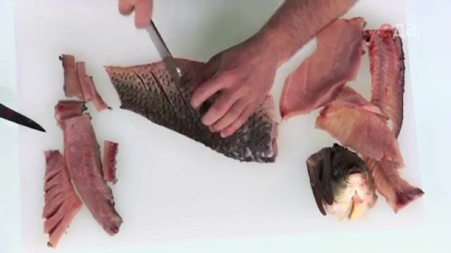 - Corta la carpa a lo largo del lomo, corta las costillas de un lado y extiéndelas como un libro para que la carcasa quede plana. Quita las entrañas, arranca las branquias.