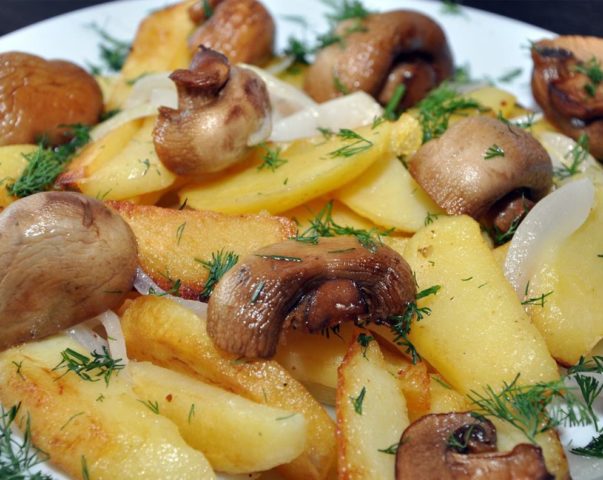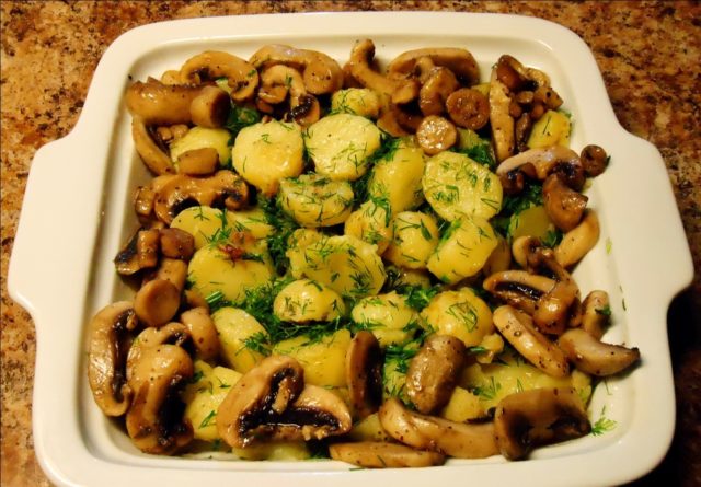 Un plato de patatas con champiñones (horneados en horno caliente) puede convertirse en cotidiano o decorar una mesa para unas vacaciones. Cocinar es rápido, la tecnología no requiere habilidades culinarias especiales. El producto es popular entre los vegetarianos y las personas que hacen dieta.