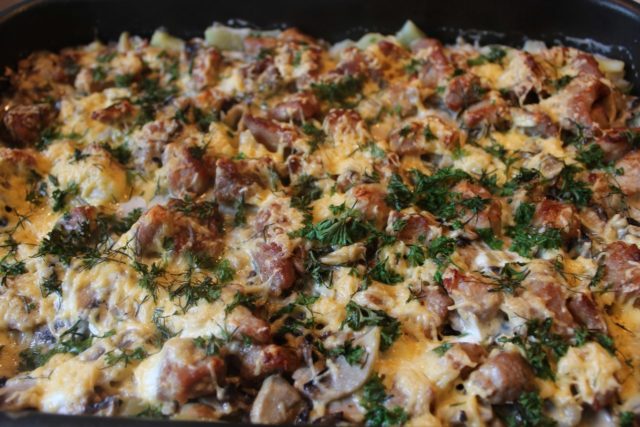 Para que el producto se hornee bien en el horno, es mejor tomar una bandeja para hornear ancha con lados bajos para una cazuela. Cada componente se vierte en una capa.