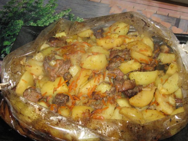 Un plato festivo muy sabroso está hecho de ternera, boletus y patatas. La receta es para 6 porciones. Para cocinar, necesita una funda para hornear, puede reemplazarla con cualquier recipiente resistente al calor.