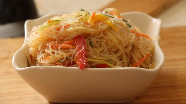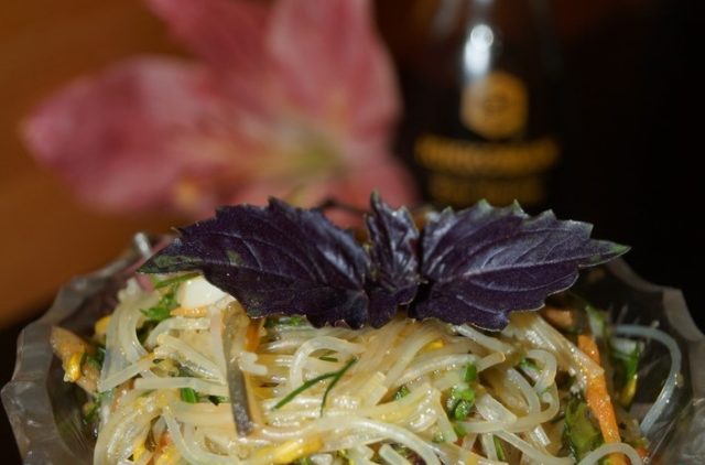 Sirva funchose en un hermoso recipiente, adornado con hierbas.