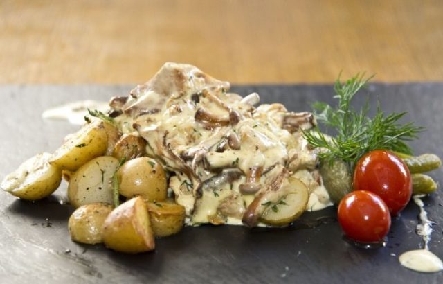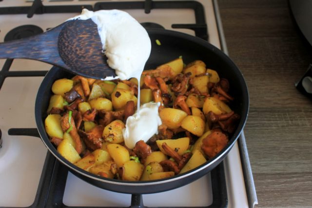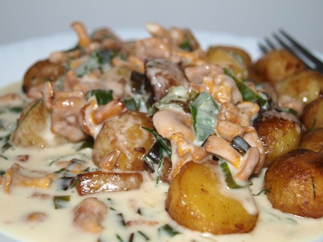 Una receta sencilla de rebozuelos en crema agria con patatas.