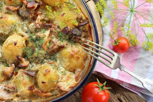 Los rebozuelos con patatas en crema agria son una delicia versátil para un nutritivo almuerzo o merienda. Las rodajas de rebozuelos se vuelven crujientes y tostadas, las papas se empapan en jugo de champiñones y la salsa de crema agria envuelve los ingredientes y combina el sabor del plato.