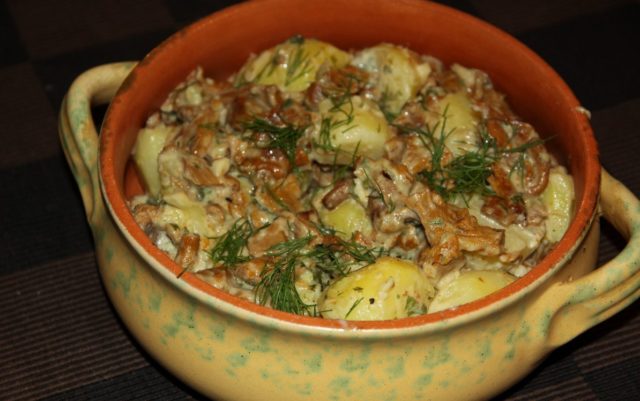 Rebozuelos guisados en crema agria con patatas, cocidos en ollas, languidecen en su propio jugo, esto los hace suaves y nutritivos.