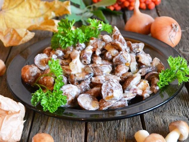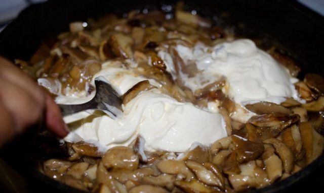 Se vierte una pequeña cantidad de aceite vegetal en una sartén caliente. Luego se esparcen allí las setas cortadas en trozos. Se fríen durante 15-20 minutos a fuego lento hasta que se doren. Después de eso, extienda la crema agria en una sartén, modifíquela bien y cocine por otros 5-7 minutos. Salpimentar el plato terminado al gusto.