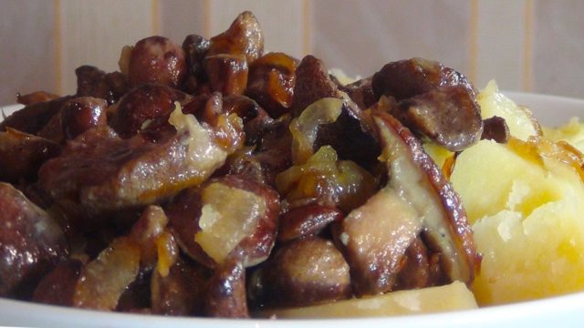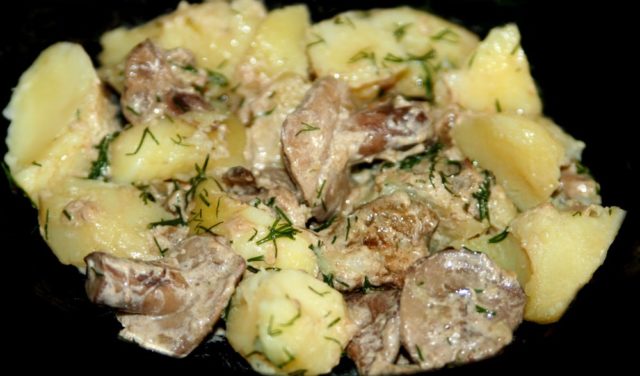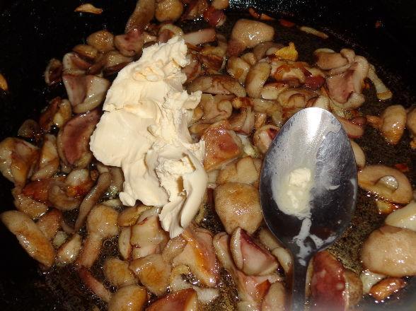 Frito en mantequilla hasta que se dore. Luego agregue sal, hierbas finamente picadas y crema agria espesa. Se mezclan bien todos los ingredientes, se tapa la sartén y se retira del fuego. Este plato es ideal como guarnición para puré de papas.