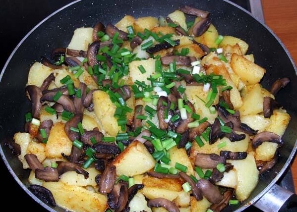 Los champiñones se pueden hervir si lo desea, o puede freírlos inmediatamente. Se cortan en trozos pequeños y se fríen a fuego medio hasta que se doren. Las patatas se pelan y cortan en cubos pequeños y se fríen en una sartén aparte con las cebollas hasta que estén cocidas. Luego, los ingredientes se combinan, se les agrega crema agria y se mezcla suavemente. La sartén con el plato se retira del fuego, se tapa con una tapa y se deja hervir a fuego lento durante unos 5 minutos.