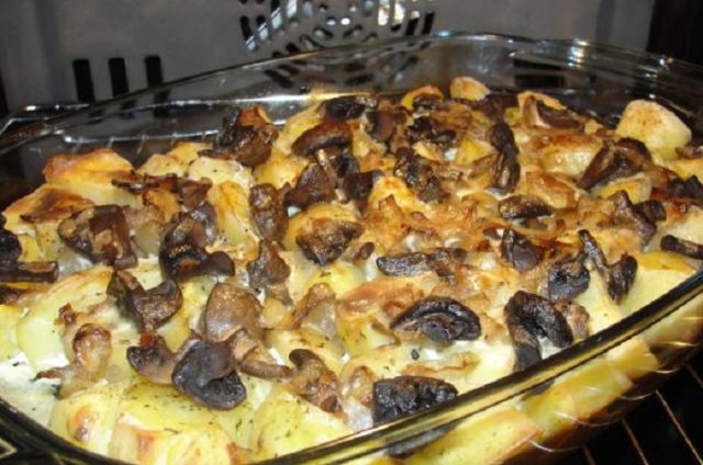 Las deliciosas recetas de hongos no están solo en la sartén. En el horno, también puede obtener una verdadera obra maestra culinaria a partir de un simple conjunto de productos. Para cocinar, necesita 600 g de patatas, 300 g de mantequilla, 180 ml de crema agria y sal al gusto.