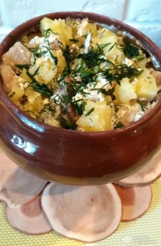 Se coloca un trozo de mantequilla en el fondo de cada olla. Luego, la mitad de la olla se llena con papas y se sala un poco. Luego esparce los champiñones y la cebolla cortada en mitades en capas. Cada olla se vierte con salsa de crema agria en una parte estrecha. Las ollas se cubren con tapas y se envían al horno durante 45 minutos a una temperatura de 190 grados.