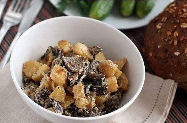 Champiñones a la miel guisados en crema agria con patatas y carne