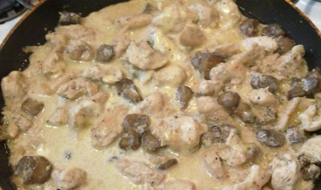 - 2.7 Setas de miel en una sartén con crema agria y pollo.