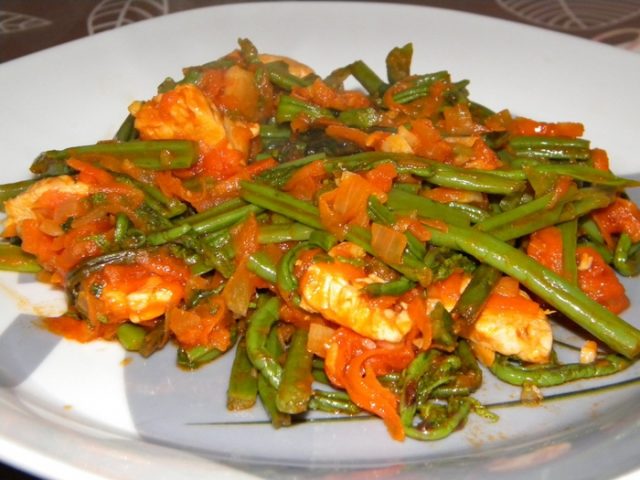 - Freír los tallos en aceite hasta que estén tiernos, agregar los pepinos y la salchicha cortada en tiritas. Ligeramente decepcionado.