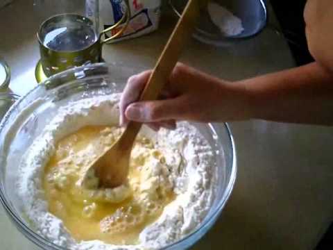 - Mezclar bien con una cuchara, agregar sal y huevos. Amasar la masa con las manos hasta que quede suave y elástica, ponerla en un plato, cubrir con una servilleta y dejar reposar media hora en un lugar fresco (se puede en el frigorífico).