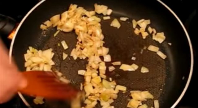 - Las cebollas se cortan finamente, se fríen en una sartén con aceite hasta que estén doradas.