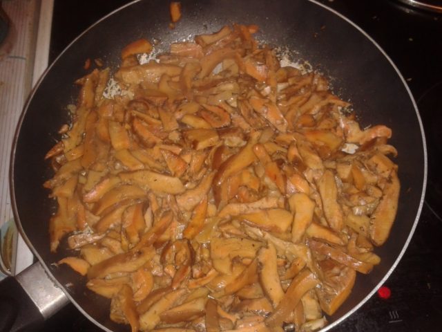 - Después de limpiar, los champiñones se trituran y se fríen en una sartén con aceite hasta que estén dorados.