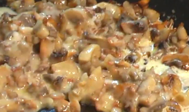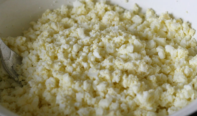 - Los huevos se hierven, se pican y se agregan a la mezcla de hongos junto con la harina y la cantidad restante de mantequilla.