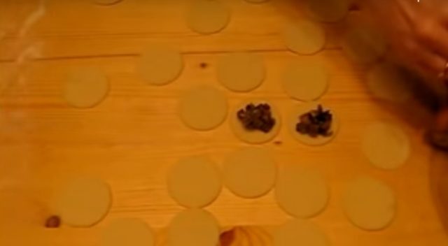 - La masa se saca del refrigerador, se extiende en una capa de aproximadamente 1,5 mm de espesor. Con una taza pequeña, corte círculos de la masa, en el centro de los cuales se coloca una pequeña cantidad de relleno.