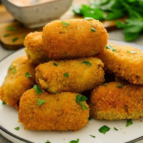 Lo mejor es servir las croquetas en un plato bonito, adornado con hierbas.