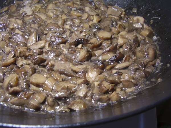 - Cuando las patatas estén lo suficientemente blandas, vierte sobre los champiñones. Baje el fuego al mínimo. Freír durante siete minutos.