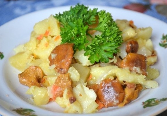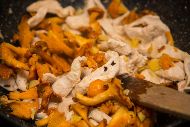 Hervir las papas hasta que estén tiernas y amasar en puré de papas. Los rebozuelos se hierven, se cortan en trozos y se fríen en una sartén con cebollas picadas. El pollo se corta en tiras y se fríe a fuego alto hasta que aparece una costra.