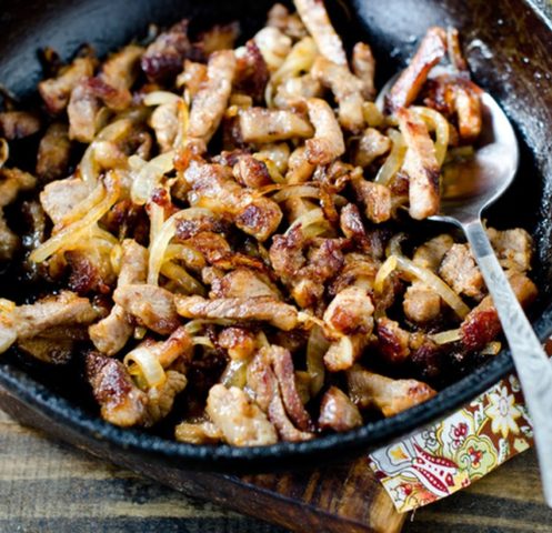 Para acelerar el proceso de cocción, puede freír la carne junto con los cuerpos de hongos hervidos y las cebollas finamente picadas. El tiempo medio de fritura es de unos 15-20 minutos. Después de eso, se agregan al plato mayonesa, sal y sus especias favoritas. El plato se cuece durante otros 10 minutos a fuego lento debajo de la tapa. Se sirve mejor con puré de papas.