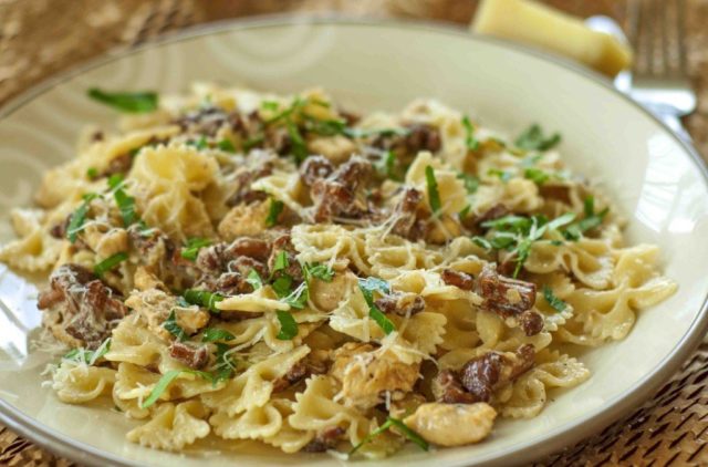 Los champiñones frescos, cortados en trozos, se fríen en aceite de oliva. Después de 10 minutos, agregue el filete de pollo picado, la cebolla y unos dientes de ajo. Cuando el pollo esté listo, viértalo con crema, revuelva y retire del fuego. Cuando la mezcla se haya enfriado un poco, se agrega a la pasta hervida y se sirve.