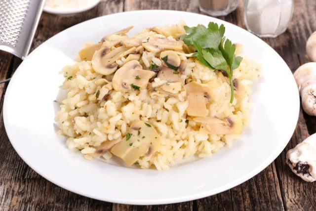 El segundo componente requerido son los hongos. Se añaden frutas frescas, secas y congeladas. Se obtiene un risotto especialmente delicioso con champiñones. Su ventaja no está solo en el sabor, sino también en la velocidad de preparación. No se remojan ni se hierven durante mucho tiempo. Además, se pueden adquirir en tiendas durante todo el año.