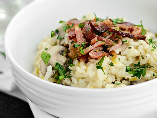 - Agregue las virutas de queso, el perejil picado, los champiñones y la mantequilla restante. Mezcla. Pon el tocino encima del risotto.