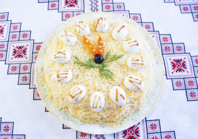 - El plato está decorado con 12 rodajas de zanahorias hervidas. En cada uno de ellos, con la ayuda de salsa de mayonesa, se dibujan los números del dial de Año Nuevo.