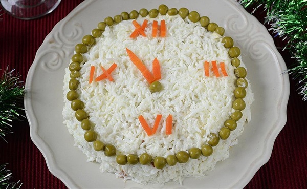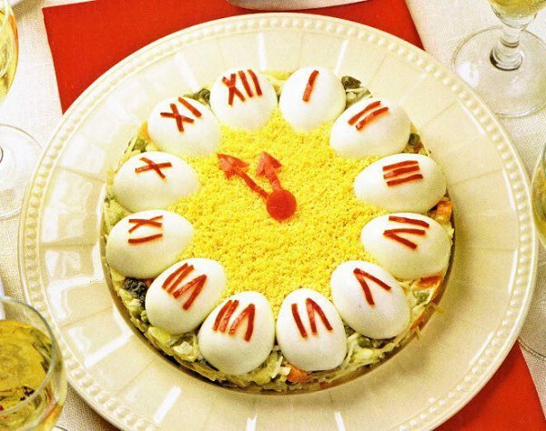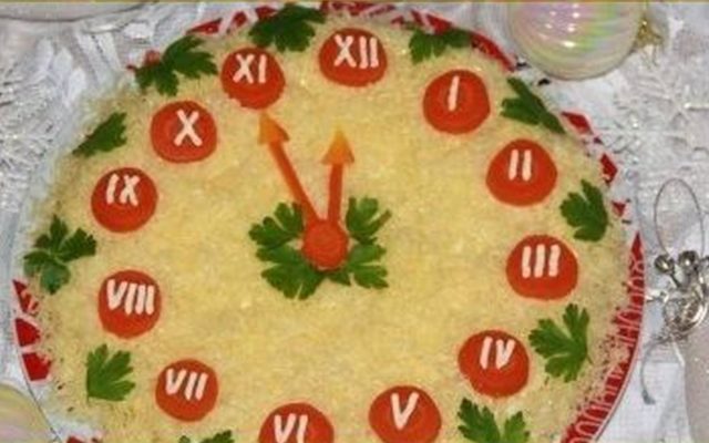 Hacer una ensalada en forma de reloj de Año Nuevo no es tan problemático como podría parecer a primera vista. El plato se coloca en el medio de la mesa festiva. Es una especie de personificación de las campanadas solemnes. Las manecillas del reloj improvisado apuntan simbólicamente al número 12.