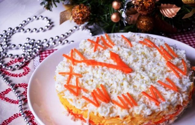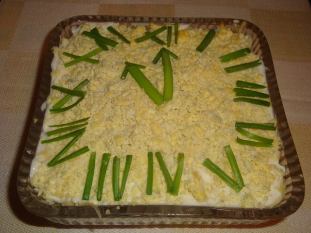 - Cada capa está cubierta con mayonesa. Luego espolvorear con masa de queso.