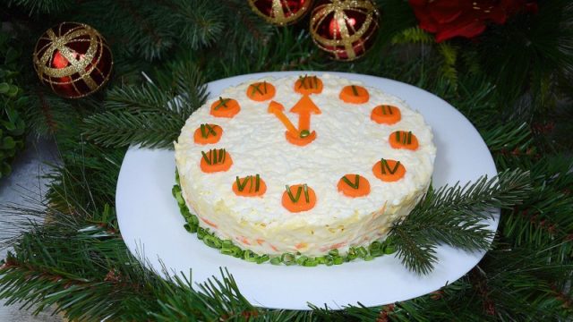 Ensalada El reloj de Año Nuevo se considera un atributo indispensable de la mesa festiva. Su característica principal es su intrincada apariencia. De hecho, hacer una ensalada no requiere mucho tiempo. Hay varias opciones de recetas que utilizan una amplia variedad de ingredientes.