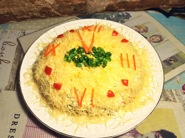 Muy a menudo, el reloj de Año Nuevo de ensalada de pescado se prepara con atún. Pero en ausencia de él, puede usar cualquier otro pescado enlatado.