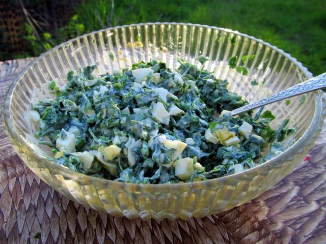 Otra opción de plato sabroso y saludable para los amantes de las verduras y las hierbas frescas. En la foto, la ensalada de ortiga y espinacas se ve muy apetecible y verdaderamente primaveral.