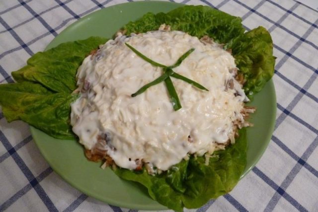 - Extiende las virutas de queso. Lubricar con mayonesa. Adorne con cebolla picada.