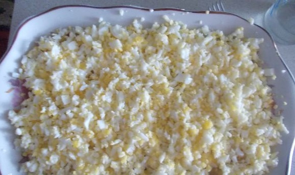 - Distribuya los huevos, rallados en un rallador mediano.