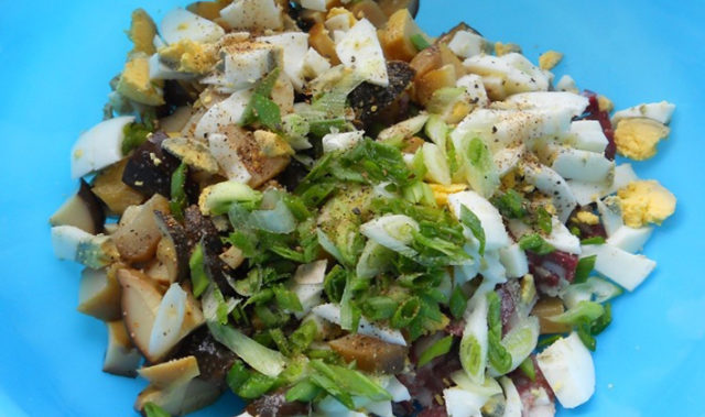 - Hervir los huevos. Enfriarse. Quite las conchas. Cortar en cubos pequeños.
