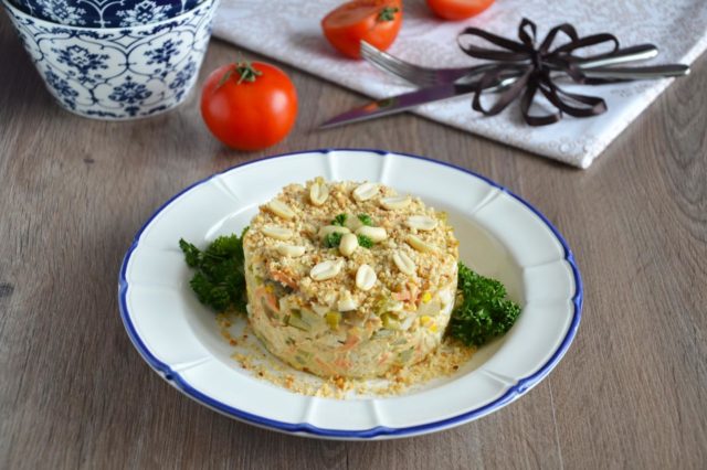 - Vierta la mayonesa. Remover. Usando el anillo de cocción, extienda la ensalada. En el proceso, apisonar. Espolvorea con nueces picadas.