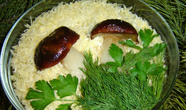 La ensalada con champiñones fritos porcini con la adición de queso resulta tierna y al mismo tiempo picante.